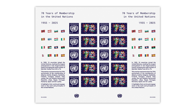 A previously unannounced pane of 10 stamps issued Dec. 10 by the United Nations Postal Administration commemorates 70 years of United Nations membership for 16 countries.