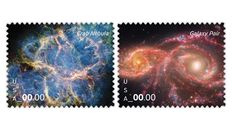 In 2026 the United States Postal Service will issue two new stamps in its Stellar Formations series: a Priority Mail stamp picturing the Crab Nebula and a Priority Mail Express stamp featuring a composite image of the IC 2163 and NGC 2207 galaxies.