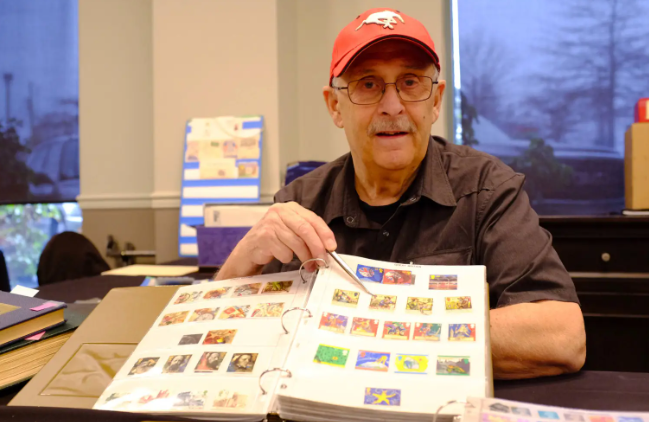 Terril Leishman poses with one of his binders, containing stamps he has been collecting since he was 11, after a lifetime of travels around the world. (Olivier Laurin/Victoria News)