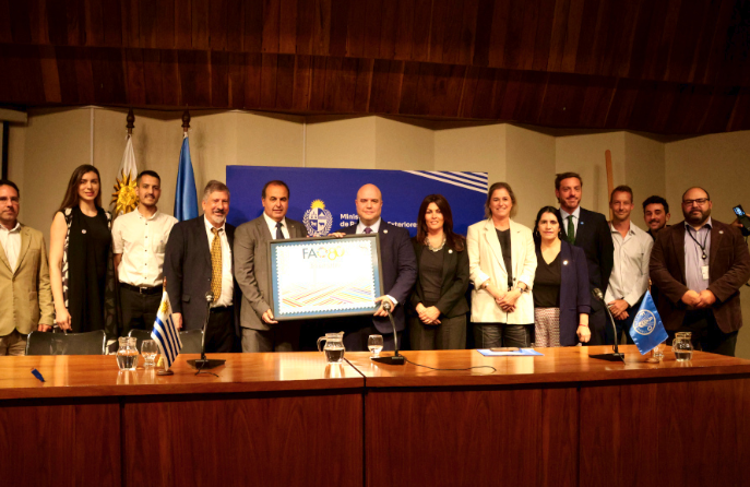 At an event held in the Reinaldo Gargano Hall, Correo Uruguayo presented a special postage stamp to celebrate the eightieth anniversary of the Food and Agriculture Organization of the United Nations (FAO), highlighting the global commitment to eradicating hunger and human dignity.